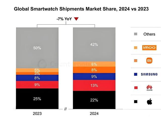 从Apple Watch初代上市,苹果就占据了近50%的市场份额,截止到2024年底,即便在百花齐放,强手如云的今天,Apple Watch仍然保持着22%的市占率,几乎是消费者的首选智能手表。